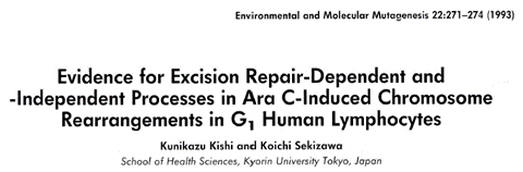 Kishi, K., & Sekizawa, K.: Evidence for excision repair-dependent and -independent processes in ara C-induced chromosome rearrangements in G1 human lymphocytes. Environ. Molec. Mutagen. 22, 271-274.1993.